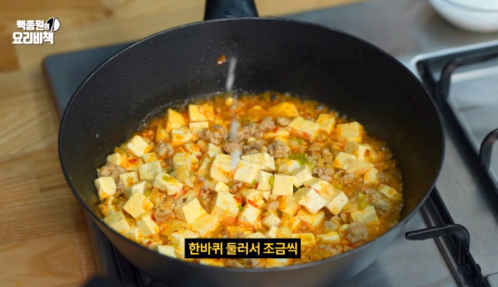 데친 두부를 넣고 졸입니다. "어느 정도 졸아들면 전분물을 한 바퀴 둘러서 약불에서 꾸덕한 식감을 만들어준다."
